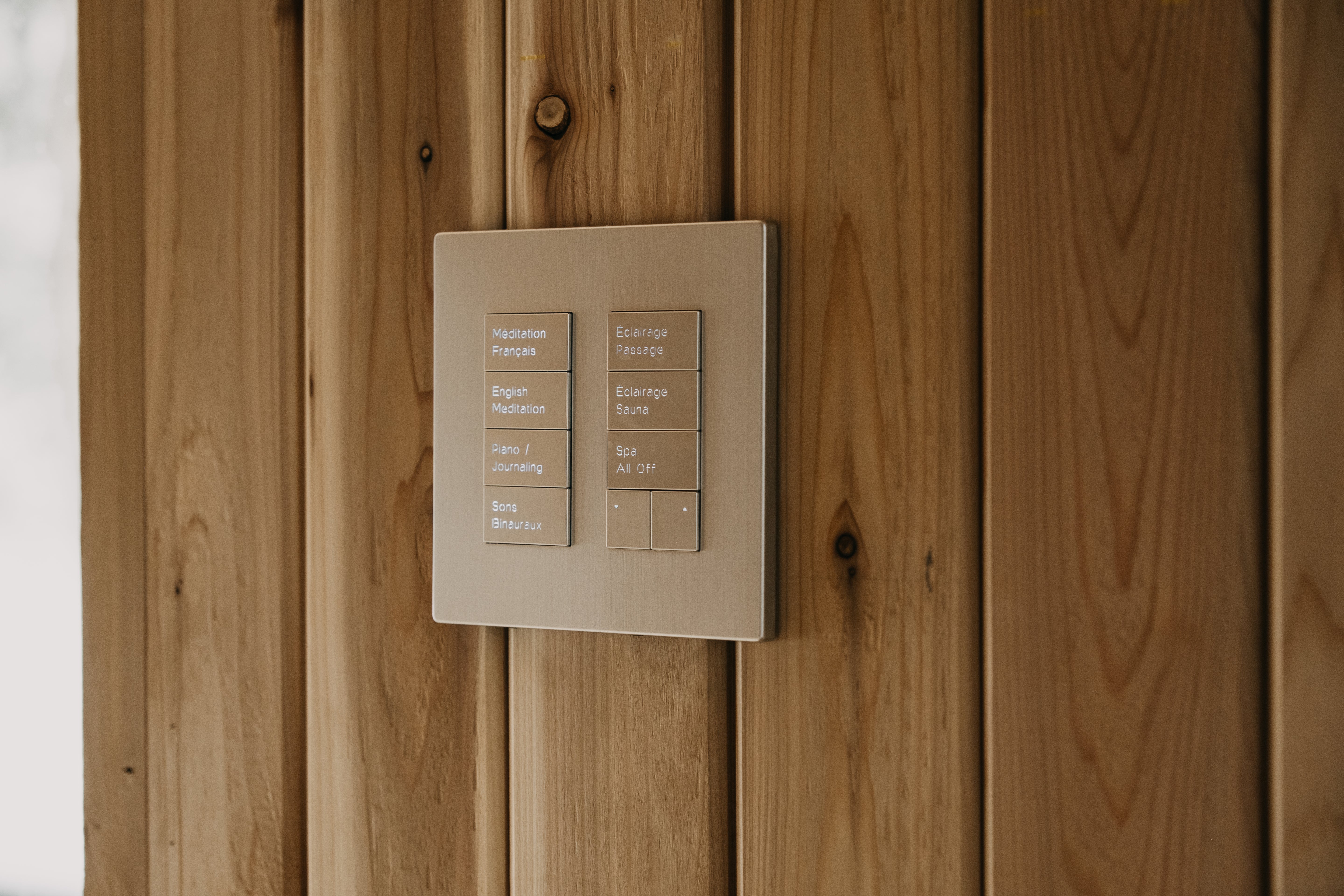 Dans le couloir de soin, nos interrupteurs permettent d’enrichir l’expérience de bien-être en offrant un environnement sonore immersif. Au choix, des méditations guidées en français et en anglais, ou encore des playlists apaisantes de sons binauraux ou de piano - accessibles d’une simple pression. La diffusion se fait directement dans les pièces fermées, créant une bulle intime et personnalisée où chaque visiteur peut se détendre, se recentrer et prolonger les bienfaits des installations.